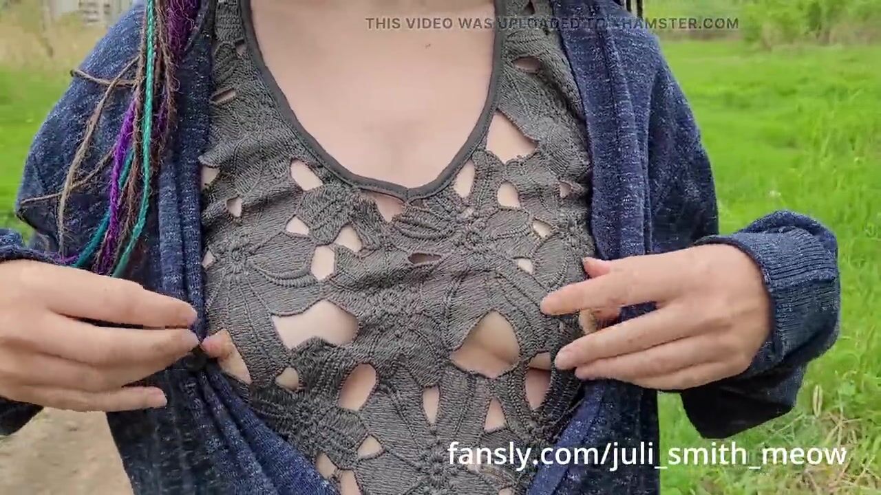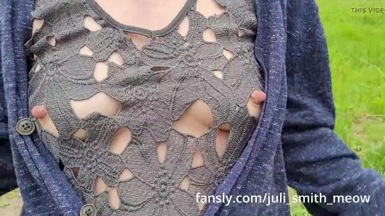 hard nipples visible through holes in dress