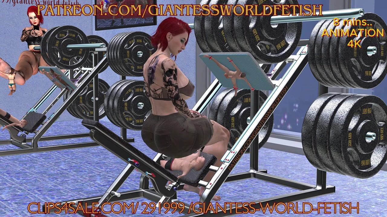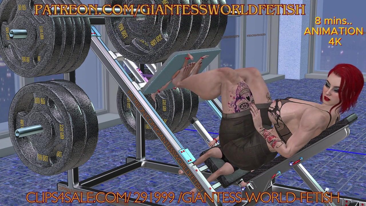 A powerful, muscular woman crushed and destroyed testicles, heads, and bodies of tiny slaves while d